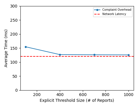 Unlike the hash-based structures (CCBF) used in the original FACTS system, our proposed follow-up design runs by two non-colluding servers with malicious security. A primary concern is whether these secure 2-party computations introduces prohibitive data transfer or latency, which in turns hurts the capability of the design to handle the large scale of users and messages.